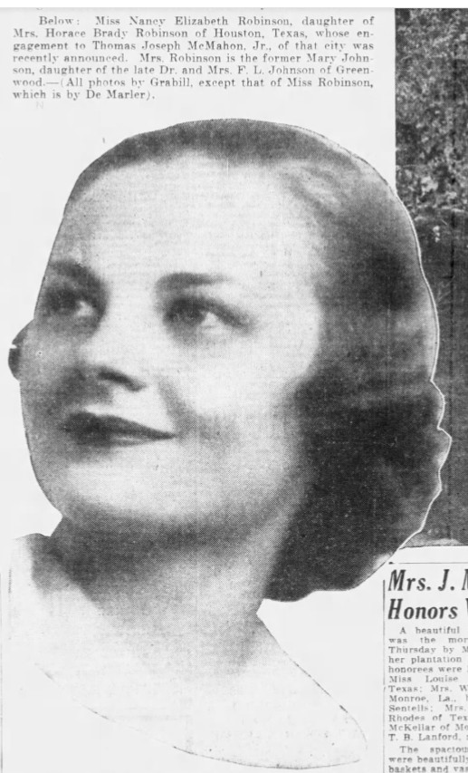 The engagement of his surviving daughter Nancy Elizabeth Robinson to Thomas Joseph McMahon, Jr. was subsequently announced by The Shreveport Journal in Shreveport, Louisiana in its 4 September 1937 edition.