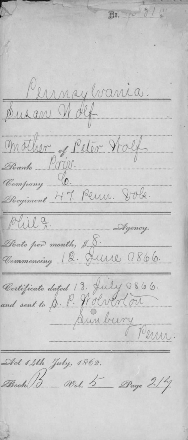 Susan Wolf’s U.S. Civil War Mother’s Pension Award and Amount, 12 June 1866_pubdom