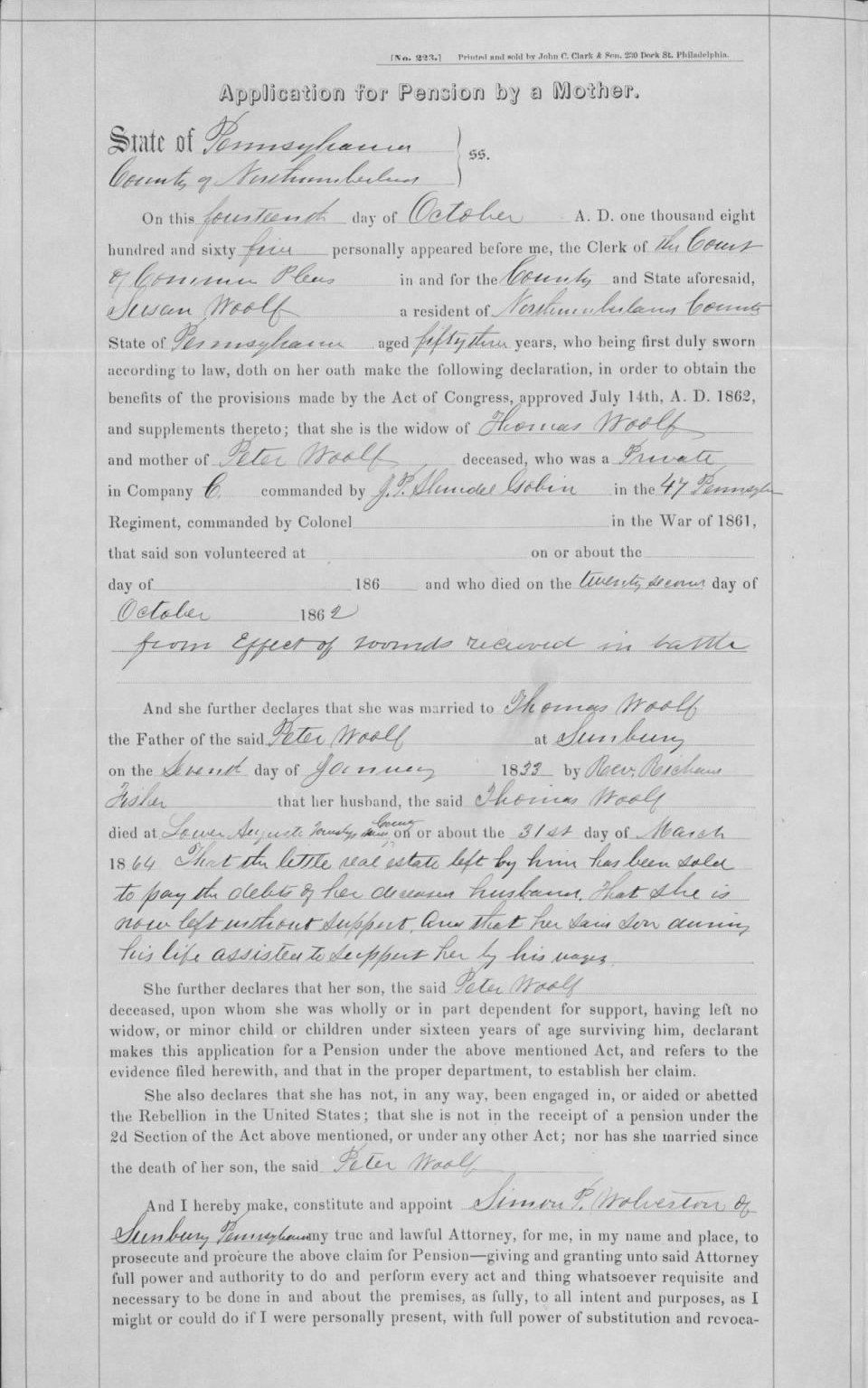 Susan Wolf’s U.S. Civil War Mother’s Pension Claim, 14 Oct 1865, Completed App pp. 2-3_pubdom