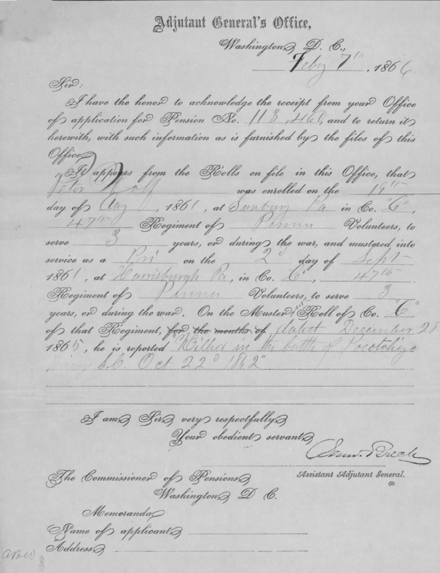 1865-1866 Confirmation by U.S. Adj. Gen. and U.S. Pension Bureau of Peter Wolf’s 1862 Battle of Pocotaligo Death_pubdom