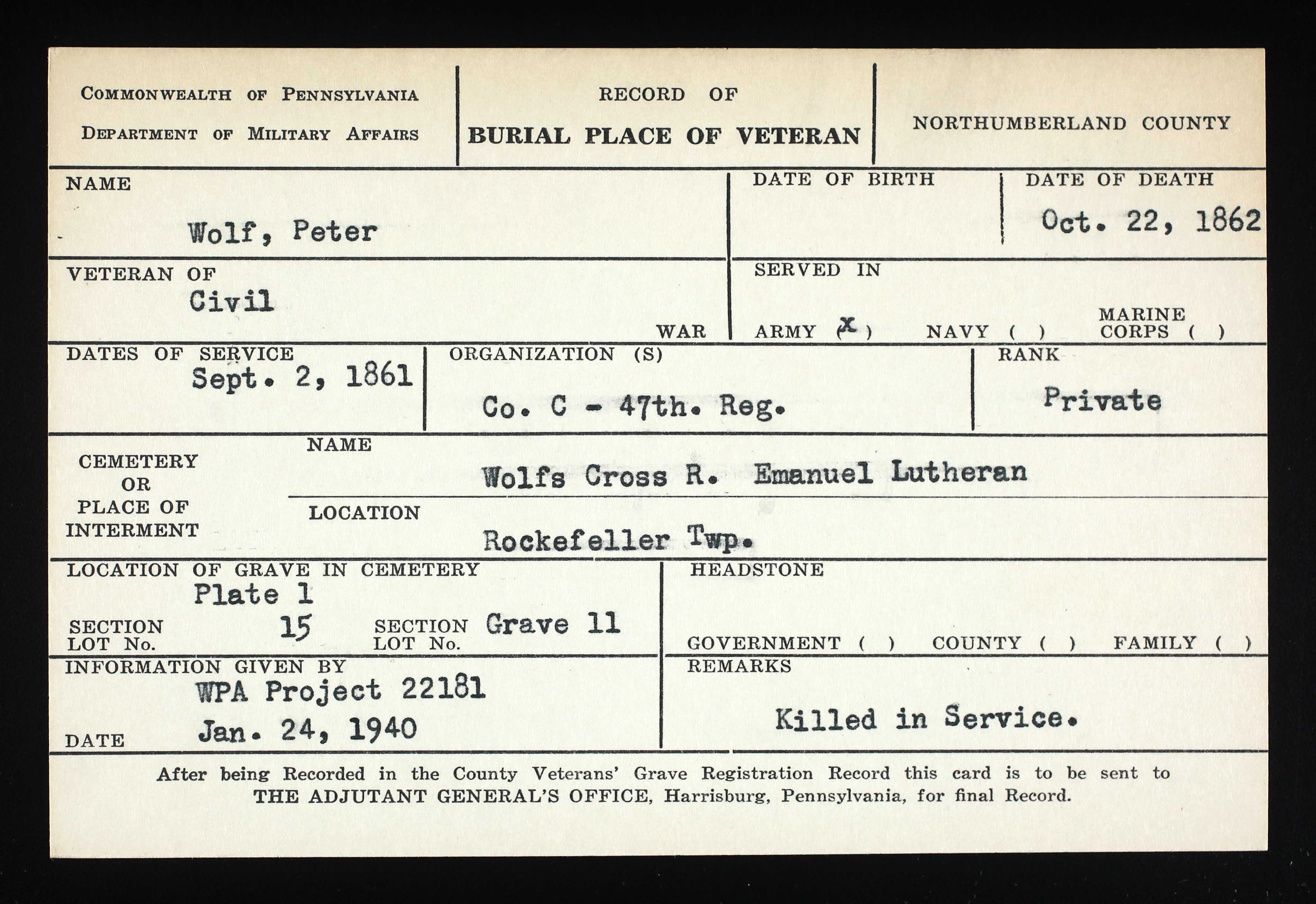 Private Peter Wolf’s burial location (Records of Places of Burial, Commonwealth of Pennsylvania, Department of Military Affairs, public domain).