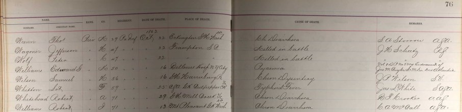 Private Peter Wolf’s entry in the U.S. Army’s Register od Deaths of Volunteer Soldiers, 1862 (U.S. National Archives and Records Administration, public domain).
