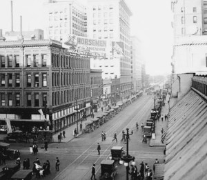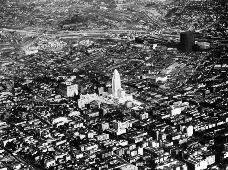 1928 aerial view of Los Angeles, California, the new city hall gleaming in the sun (public domain; click to enlarge).