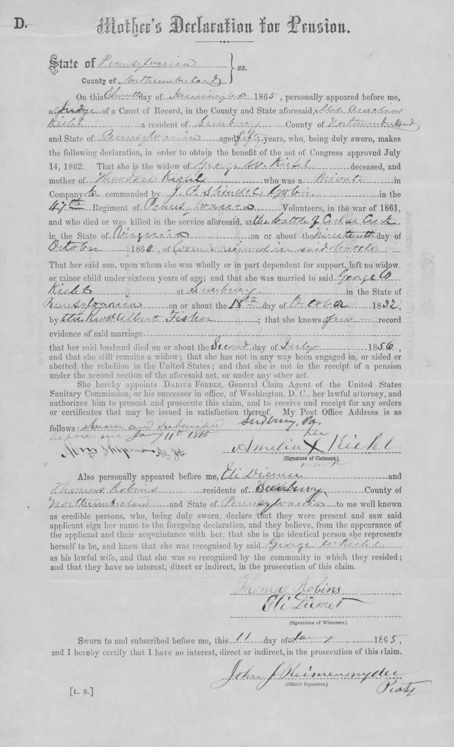 Sunbury residents George W. Heilman and Charles Weaver then added to this testimony by attesting that they also had both been well acquainted with Amelia Kiehl and knew “from their own personal knowledge, that [Amelia Kiehl] actually received her principle support, if not wholly, from her said son Theodore Kiehl, for a period of about four years immediately preceding his death, by regularly transmitting his pay from the army to his said Mother, up to the time of his death; to pay her house-rent board, and other necessaries for life.” They then confirmed that she resided “in a house belonging to the estate of Charles H. Heilman deceased.”