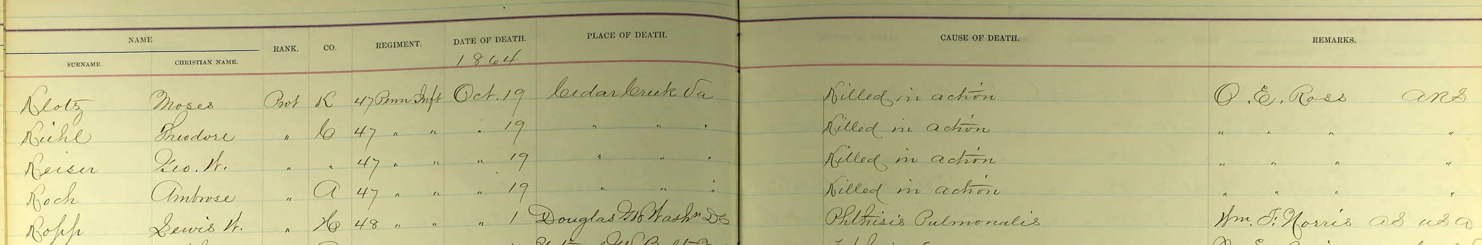 But it was another extremely costly engagement for Pennsylvania’s native sons. The 47th experienced a total of one hundred and seventy-six casualties during the Battle of Cedar Creek alone, including: Sunbury Guards’ Sergeants John Bartlow and William Pyers, and Privates James Brown (a carpenter), Jasper B. Gardner (a railroad conductor), George W. Keiser (an 18-year-old farmer), Joseph Smith, John E. Will, and Theodore Kiehl—all dead.