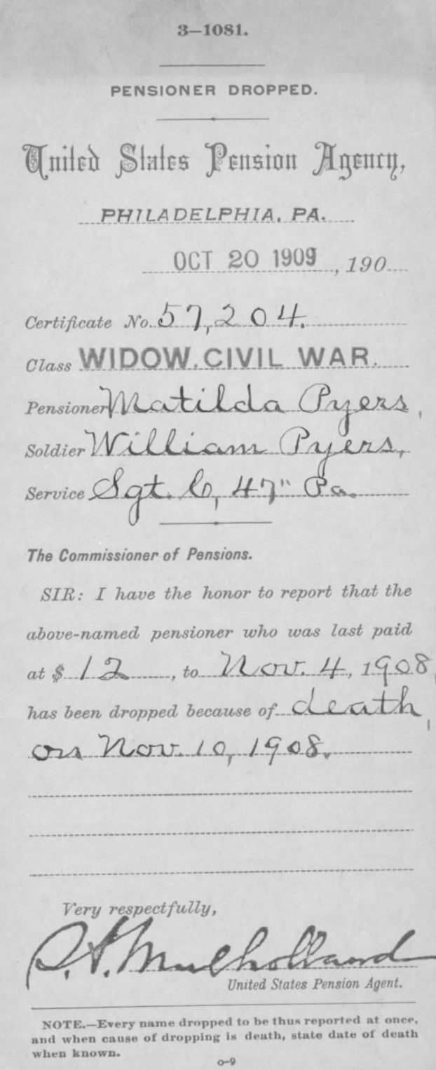 Matilda Pyers’ U.S. Civil War Widow’s Pension Award and Amount (U.S. Civil War Widows’ Pension Files, U.S. National Archives and Records Administration, public domain).