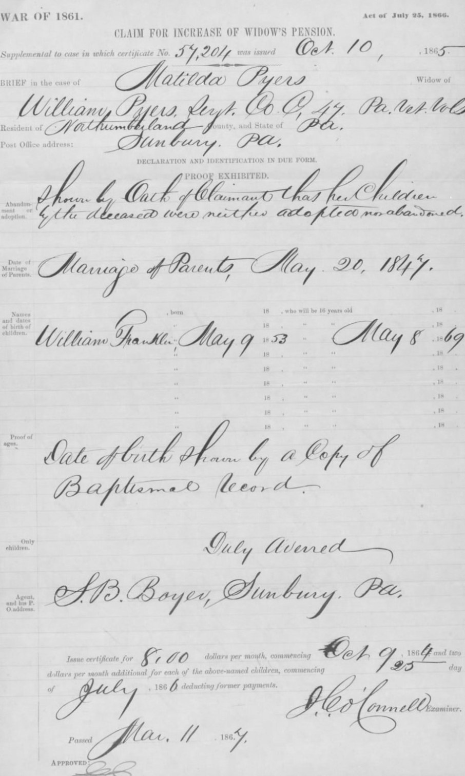 Matilda Pyers’ Request for an Increase in Her U.S. Civil War Widow’s Pension (U.S. Civil War Widows’ Pension Files, U.S. National Archives and Records Administration, public domain).