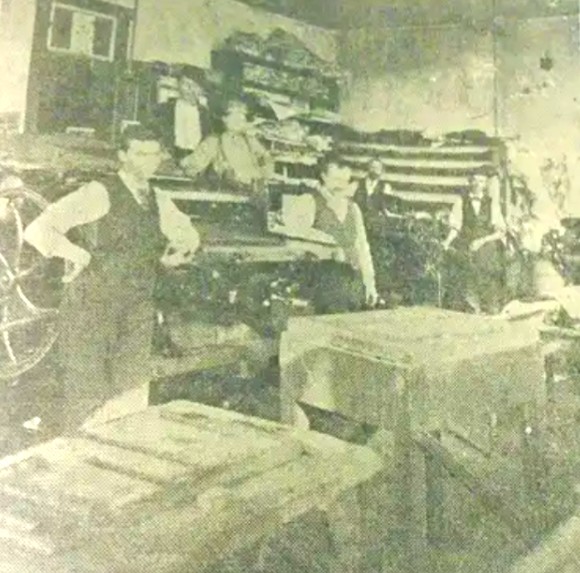 Jacob Keefer was one of the Sunbury Daily staff members in this photograph taken at the newspaper’s production area (Sunbury, Pennsylvania, circa early 1900s, public domain).