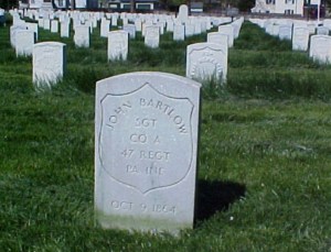 The grave of Sergeant John Bartlow, Company C, 47th Pennsylvania Volunteers, Winchester National Cemetery, Winchester, Virginia (courtesy of Jonelle Trimmer, used with permission).