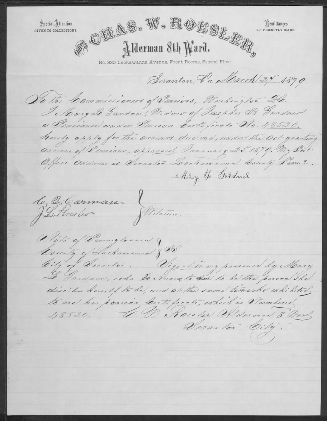 Alderman Charles W. Roesler’s Petition to U.S. Pension Bureau to Pay Pension Funds Owed to Mary Gardner, 1879 (U.S. National Archives and Records Administration, public domain).
