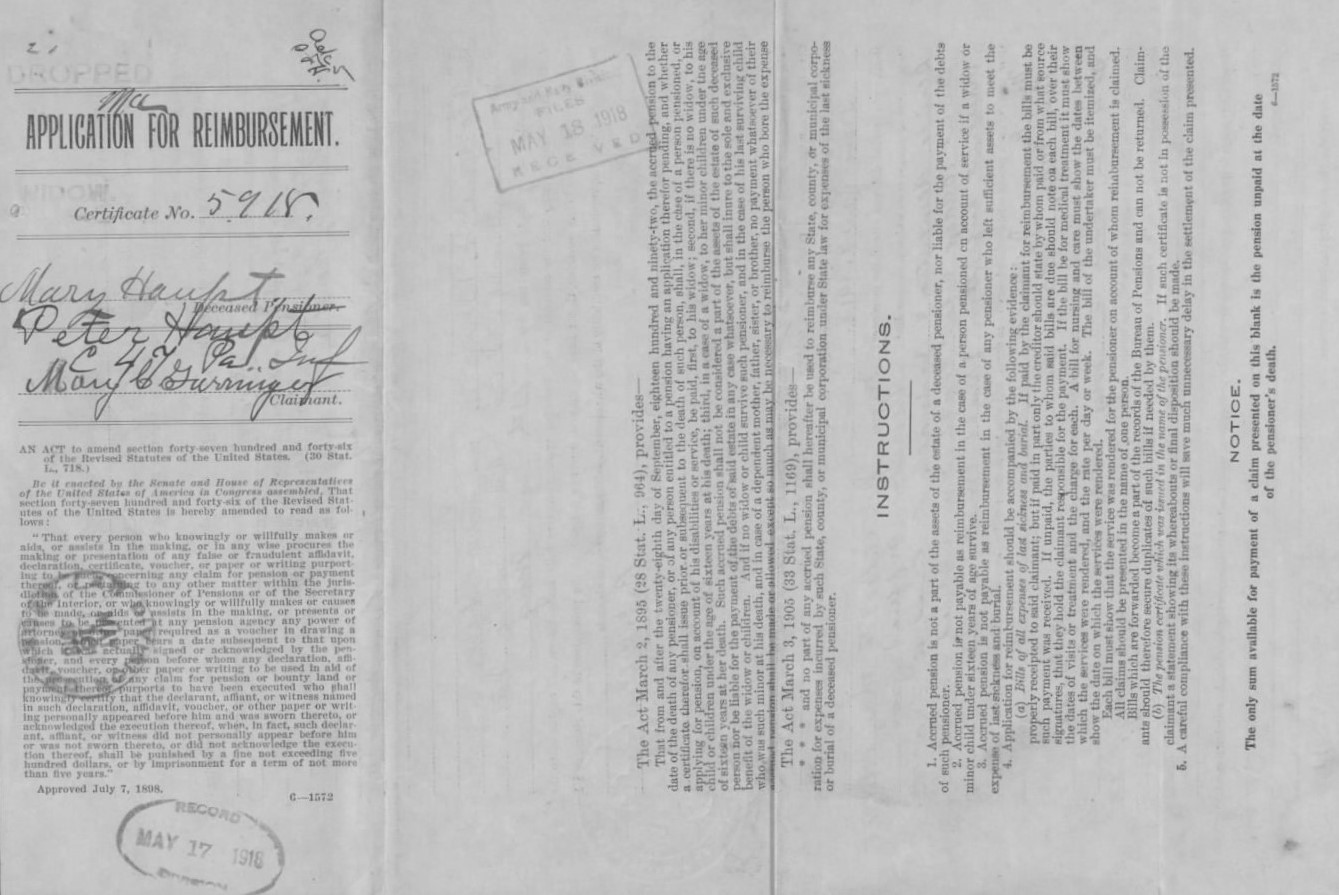 Reimbursement Claim by Mary Garringer for Final Expenses of Mary Haupt, 1918 (cover, U.S. Civil War Widows’ Pension Files, U.S. National Archives and Records Administration, public domain).