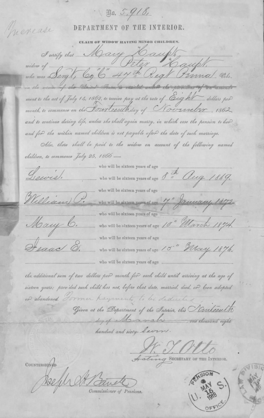 Mary Haupt’s U.S. Civil War Widow’s Pension Award and Amount, 19 Mar 1867, p. 2