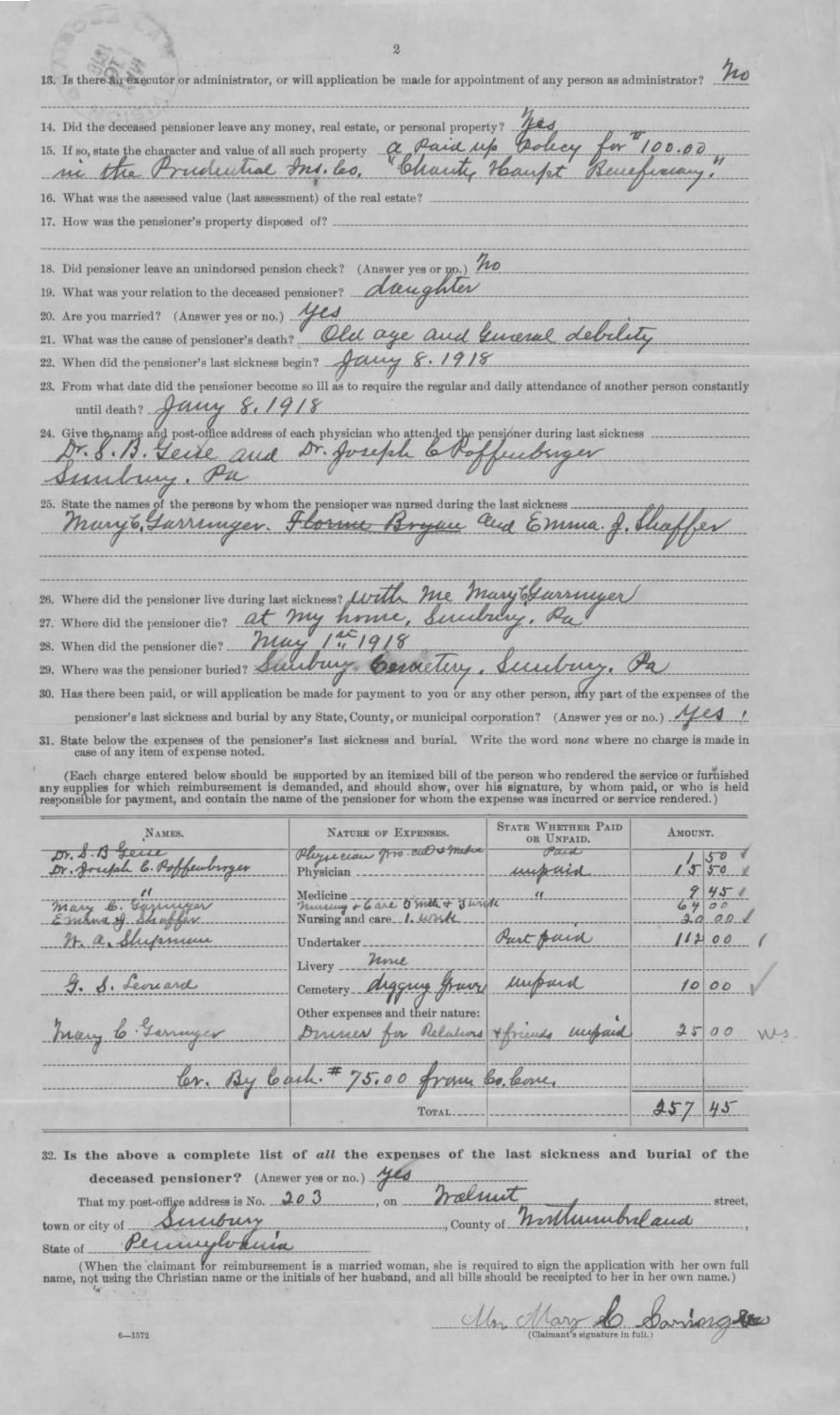 Mary Haupt’s U.S. Civil War Widow’s Pension, Mary Garringer’s 1918 Claim for Reimbursement of Haupt Final Expenses, p. 2