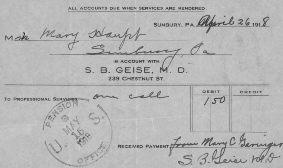 Mary Haupt’s U.S. Civil War Widow’s Pension, Mary Garringer’s 1918 Claim for Reimbursement of Haupt’s Final Expenses, Physician’s Bill 2_pubdom