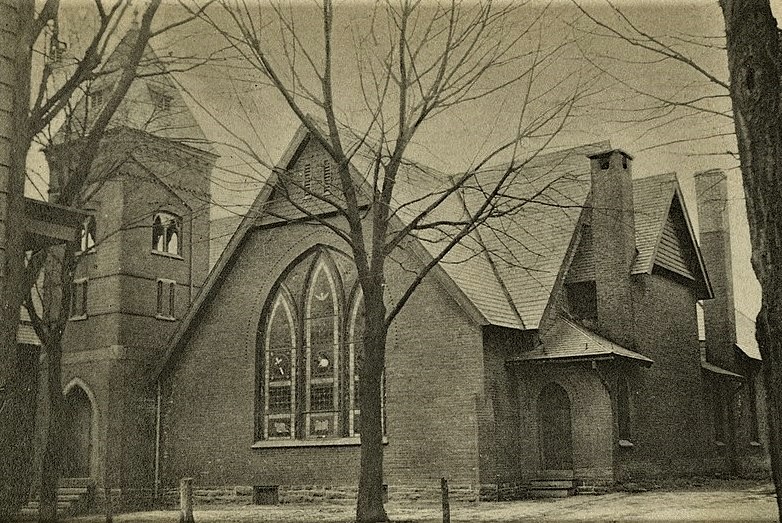 [By the early 1830s], the town, then known as Petersburg, had grown from the small settlement to a village of considerable size, and a new church had been built on High Street and was dedicated in August, 1841. It was a frame church, 40×50 feet in size, and on the site of the present church. The Sunday school was held for a time in the old building on the heights, but was soon transferred to the new school building, where it met until the church was erected. Occasional services were also held in the old church until April 12, 1866, when a storm laid it in ruins….