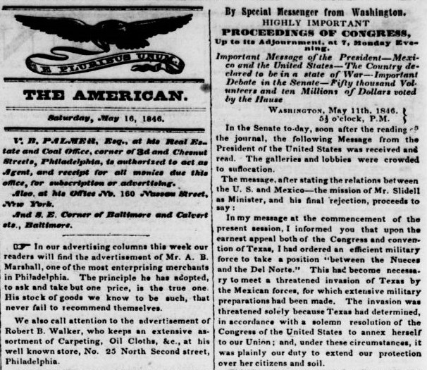 - “By Special Messenger from Washington. HIGHLY IMPORTANT PROCEEDINGS OF CONGRESS, Up to Its Adjournment, at 7, Monday Evening. Important Message of the President—Mexico and the United States—The Country declared to be in a state of War—Important Debate in the Senate—Fifty thousand Volunteers and ten Millions of Dollars voted by the House.” Sunbury, Pennsylvania: Sunbury American, 16 May 1846.