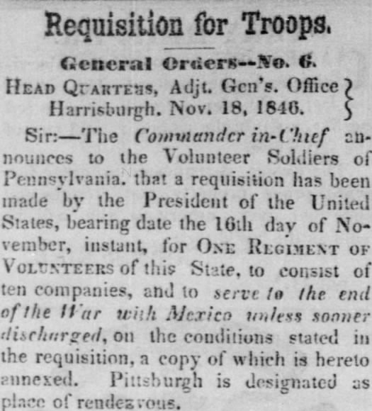 Harrisburgh [sic]. Nov. 18. 1846.Sir:—The Commander-in-Chief announces to the Volunteer Soldiers of Pennsylvania, that requisition has been made by the President of the United States, bearing date the 16th day of November, instant, for ONE REGIMENT OF VOLUNTEERS of this State, to consist of ten companies, and to serve to the end of the War with Mexico unless sooner discharged, on the conditions stated in the requisition, a copy of which is hereto annexed. Pittsburgh is designated as place of rendezvous.