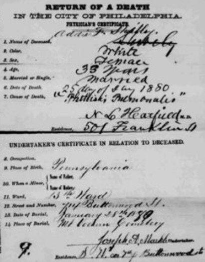 Physician’s death certificate for Addie F. (Topley) Sheibley, Philadelphia, Pennsylvania, 1880 (Philadelphia City Archives, public domain).