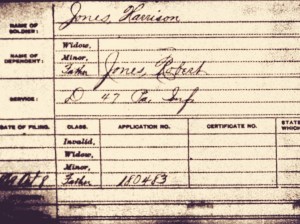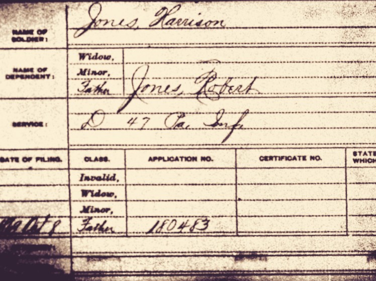 Private Harrison Jones, 47th Pennsylvania Volunteers, and his father, Robert Jones (U.S. Civil War Pension General Index Cards, 8 October 1869, U.S. National Archives and Records Administration, public domain).