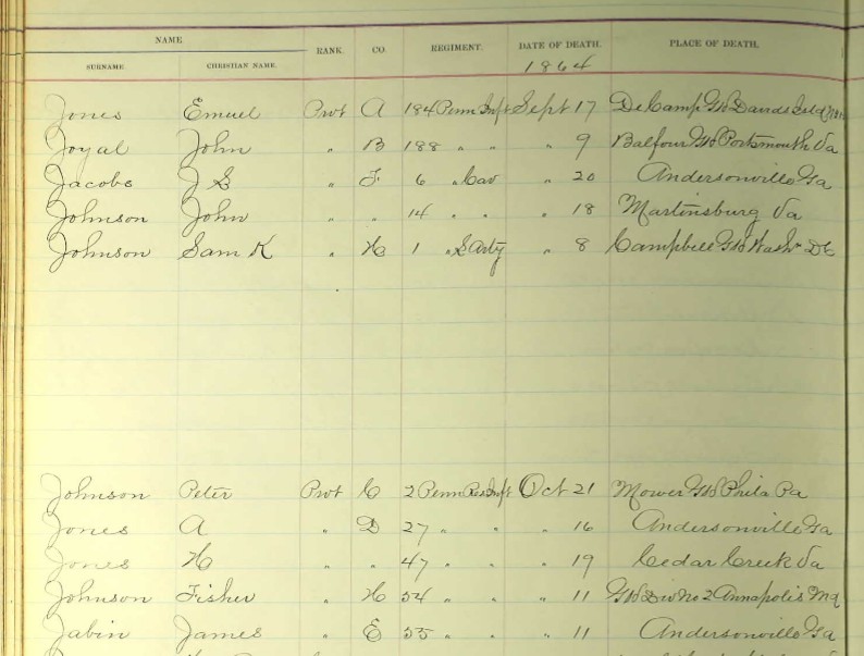 - Jones, Harrison, in Civil War Veterans’ Card File, 1861-1866 (Company D, 47th Pennsylvania Infantry). Harrisburg, Pennsylvania: Pennsylvania State Archives.