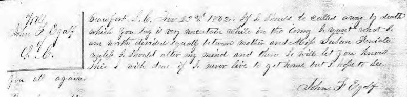 Last will and testament of Private John F. Egolf, 47th Pennsylvania Volunteers, Beaufort, South Carolina, 23 November 1862 (U.S. National Archives and Records Administration, public domain).