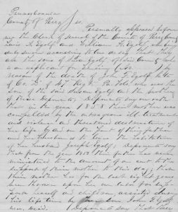 Excerpt from an 1869 affidavit filed by George and Agnes Souder, supporting the U.S. Civil War Mother’s Pension application of Susan Egolf, the mother of 47th Pennsylvania Volunteer John F. Egolf (documentation of spousal abuse, affidavit, p. 1, U.S. Civil War Pension Files, Susan and John Egolf, U.S. National Archives and Records Administration, public domain; click to enlarge).