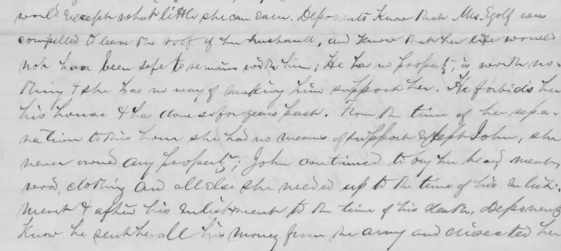 The next year soldier [John F. Egolf] bought a house expressly for his mother, where she lived four years free of rent. Since soldier’s death she had the rent of the house $8 per year. — This is all she had except what she can earn. Husband has no property — could not be compelled to support her.