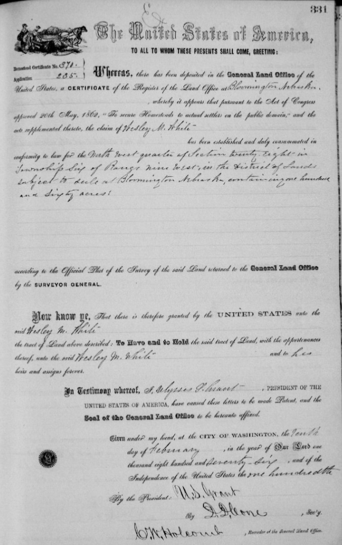 By 1875, Wesley White had made up his mind to join his family on their western adventure. Applying for land in Nebraska under the U.S. Homestead Act of 1862, he learned that his request was approved by the register of the U.S. Land Office in Bloomington, Nebraska on 10 February 1876. On that day, he was issued a patent for one hundred and sixty acres in the “North West quarter of Section Twenty-eight in Township Six of Range Nine West in the District of Lands subject to sale at Bloomington, Nebraska.”