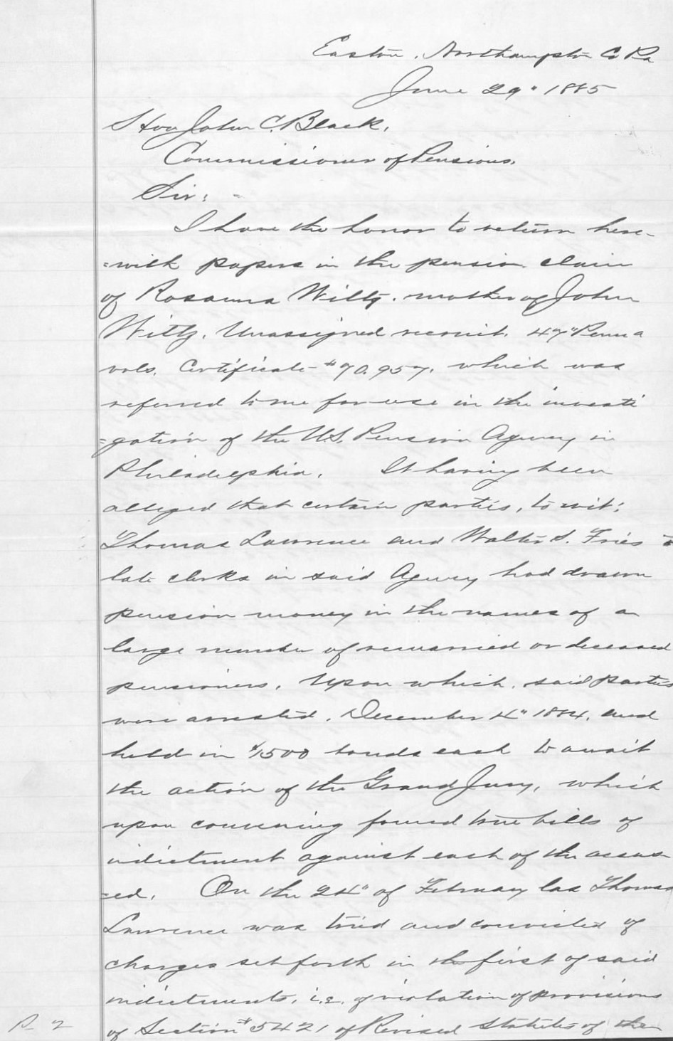 Rosanna Witz’s story did not end with her death in 1883, however; an affidavit penned on 29 June 1885 to The Honorable John C. Black, Commissioner of Pensions by a Mr. Brooks, “Special Examiner,” provided details about an investigation of the U.S. Pension Agency in Philadelphia, following the December 1884 arrest of Thomas Lawrence, a former clerk with that pension agency who had allegedly conspired with fellow clerk Walter Fries in a scheme in which they had “drawn pension money in the names of a large number of unmarried or deceased pensioners.” Lawrence was subsequently convicted on 24 February 1885 and “sentenced to a term of four years imprisonment at hard labor,” plus a $500 fine and the “costs of prosecution,” but Fries’ trial was postponed.