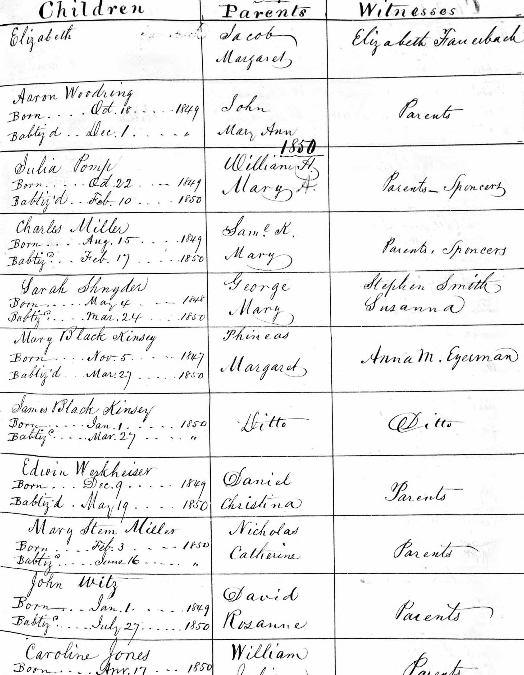 The 1849-1850 birth and baptismal records of the German Reformed Church in Easton, Pennsylvania documented the correct spelling of the surname of John C. Witz and his parents, David P. Witz and Rosanna (Ward) Witz (birth and baptism records, First United Church of Christ, Easton and the Historical Society of Pennsylvania, public domain).