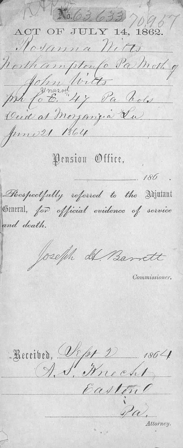 U.S. Pension Bureau’s 2 Sep 1864 Confirmation of Pvt. John Witz’s Death at Morganza, LA, 1864_U.S. Civil War Mother’s Pension File