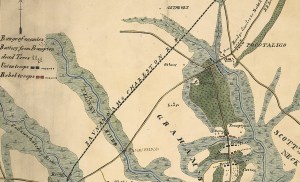 Excerpt from the U.S. Army map of the Pocotaligo-Coosawhatchie Expedition, 22 October 1862, showing the Caston and Frampton plantations in relation to the town of Pocotaligo, the Pocotaligo bridge and the Charleston & Savannah Railroad (public domain).
