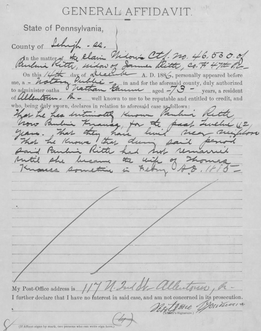 Pauline Ritter Knauss’s U.S. Civil War Widow’s Pension Restoration Claim (Gaumer affidavit, 14 December 1886, U.S. Civil War Widows’ Pension Files, U.S. National Archives and Records Administration, public domain).