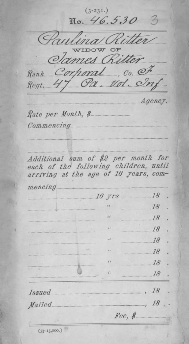 Pauline Ritter’s U.S. Civil War Widow’s Pension (pension certificate number, U.S. Civil War Widows’ Pension Files, U.S. National Archives and Records Administration, public domain).