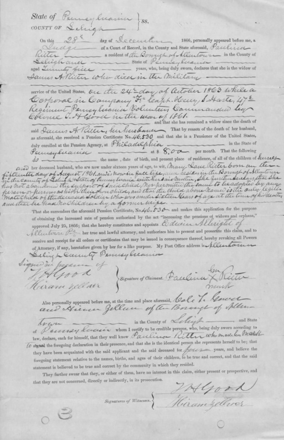 Pauline Ritter’s U.S. Civil War Widow’s Pension Claim, Pauline’s Affidavit, 28 Dec 1866, pp. 1-2_pubdom
