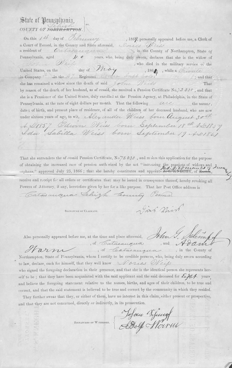 U.S. Civil War Widow’s Pension Claim of Andoras (Müller) Weiss (Andoras’s affidavit, 1 February 1867, U.S. Civil War Widows’ Pension Files, U.S. National Archives and Records Administration, public domain).