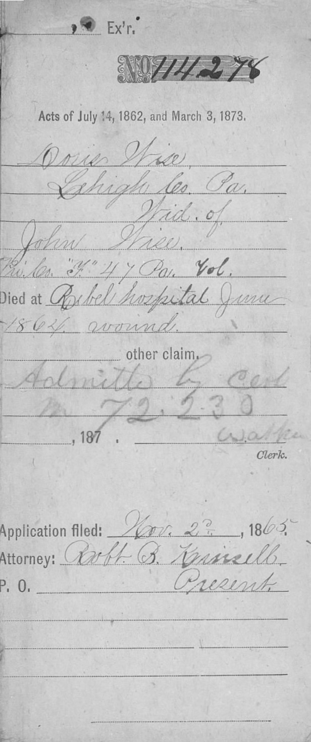 U.S. Pension Bureau’s 23 November 1865 Confirmation of Private John Weiss’s 1864 Death at a Confederate Prison Hospital (U.S. Civil War Widows’ Pension Files, U.S. National Archives and Records Administration, public domain).