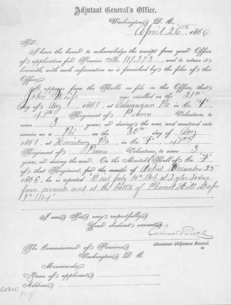 1866 Confirmation by the U.S. Adjutant General of the 1864 Confederate POW Status and Death of Private John Weiss, Company, 47th Pennsylvania Volunteer Infantry (Records, Office of the U.S. Adjutant General, 26 April 1866, U.S. National Archives and Records Administration, public domain).