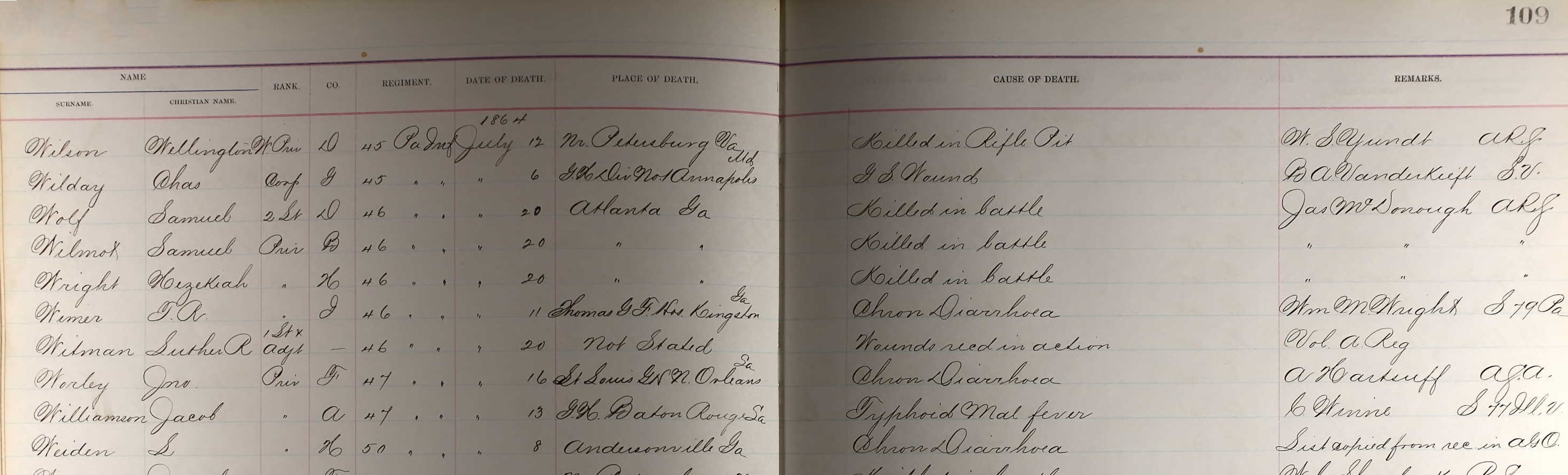 - Worley, John, in Registers of Deaths of Volunteers, July 1864, in Records of the U.S. Adjutant General’s Office. Washington, D.C.: U.S. National Archives and Records Administration.