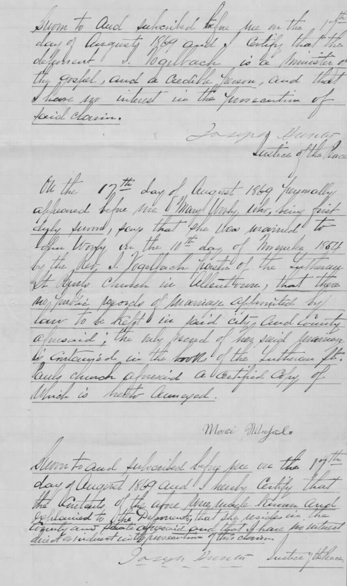 1854 Marriage of John Worley and Mary Schnaar, Affidavit, 17-18 Aug 1869, pp. 1-2_pubdom