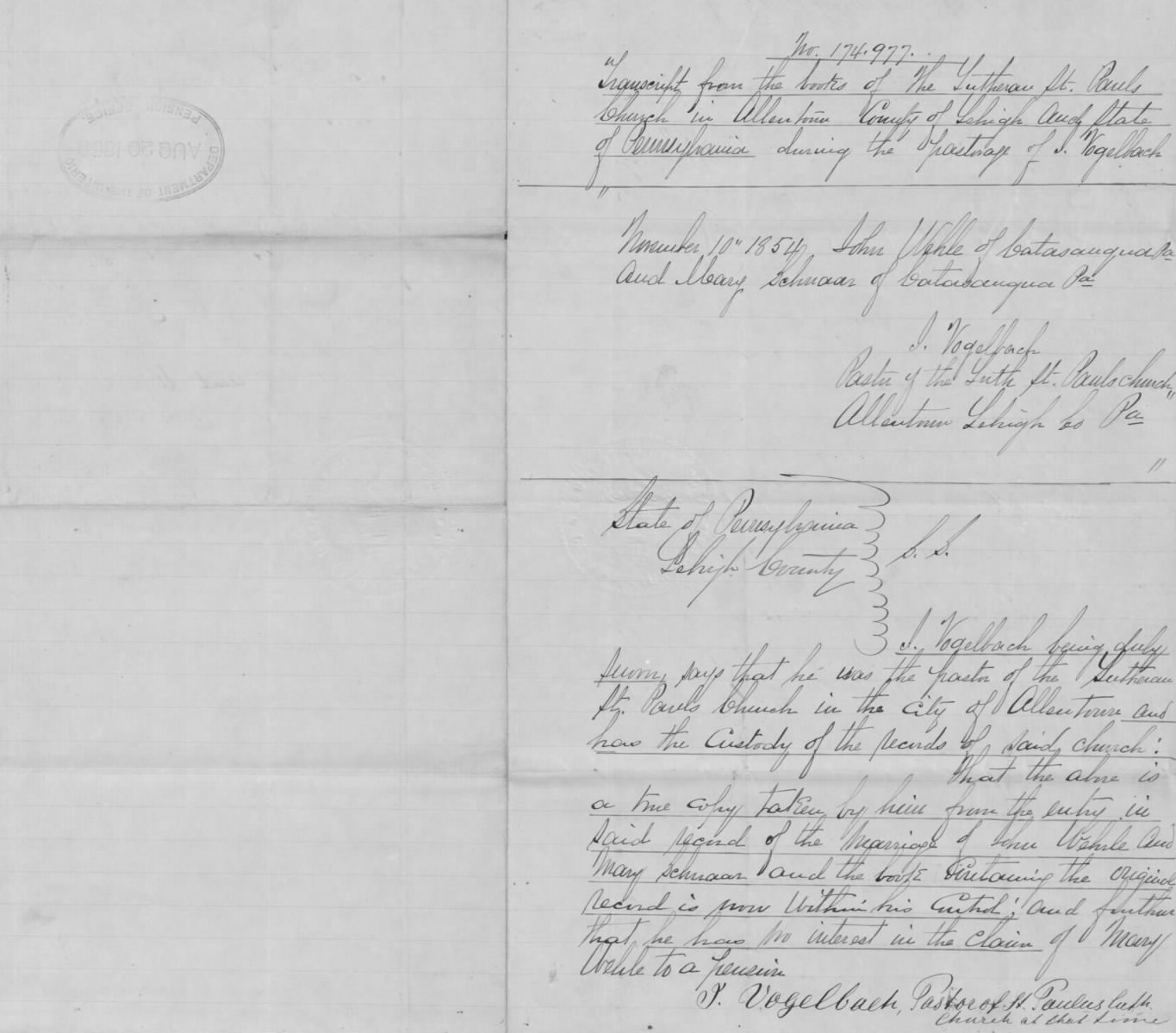 1854 Marriage of John Worley and Mary Schnaar, Affidavit, 5 May 1869, pp. 1-2_pubdom
