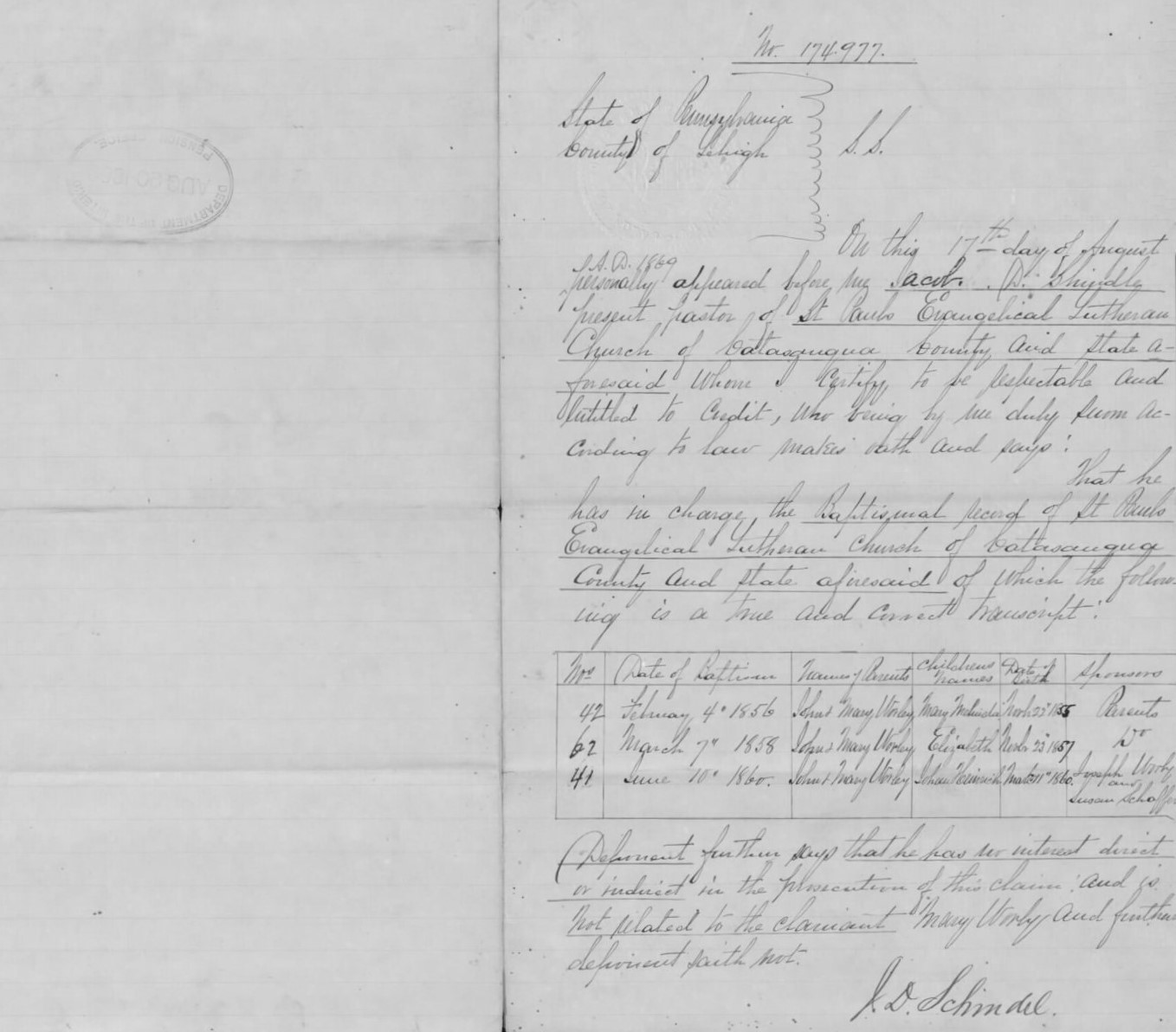 Baptismal Records of John Worley’s Children, 17 August 1869, p. 1 (U.S. Civil War Widows’ Pension Files, U.S. National Archives and Records Administration, public domain).