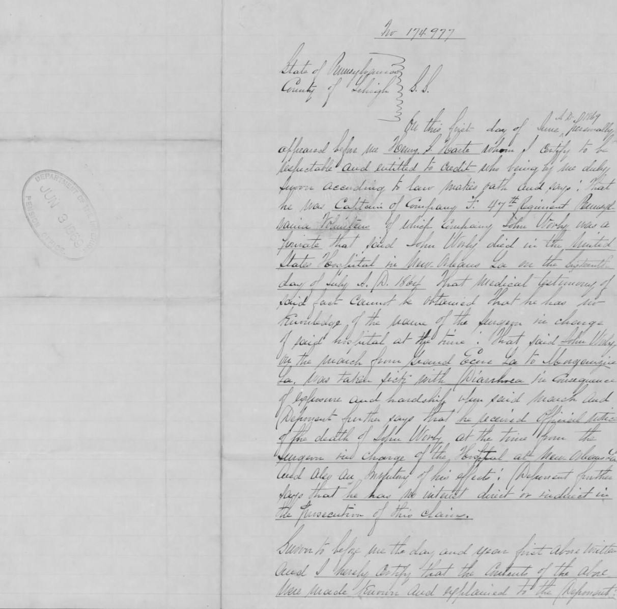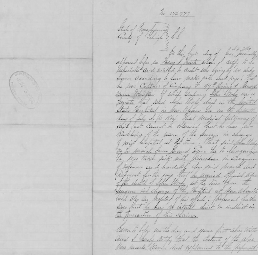 Mary Worley’s U.S. Civil War Widow’s and Orphans’ Pension Claim (Captain Henry Harte’s Affidavit, 3 May 1869, p. 1, U.S. Civil War Widows’ and Orphans’ Pension Files, U.S. National Archives and Records Administration, public domain).