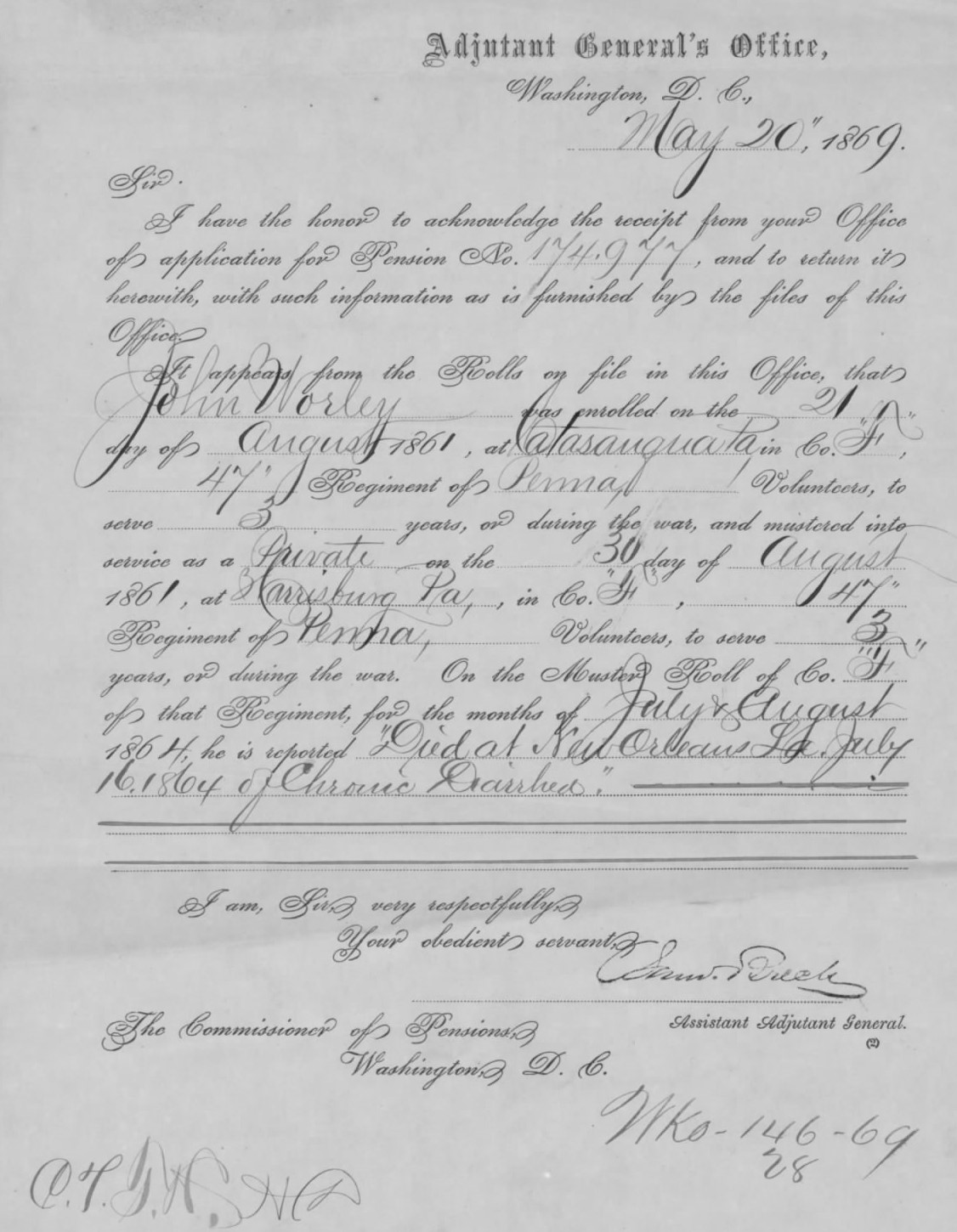 U.S. Adj. Gen.’s 20 May 1869 Confirmation of John Worley’s 1864 Disease-Related Death in Louisiana_pubdom