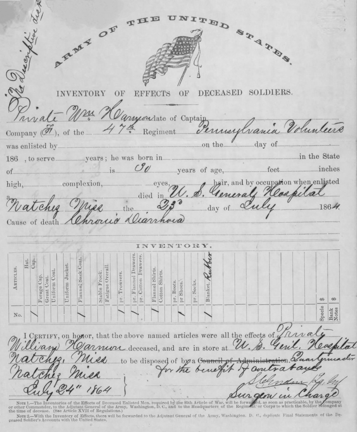List of Personal Effects for Private William Herman, 47th Pennsylvania Volunteers, Army of the United States, U.S. General Hospital, Natchez, Mississippi, 1864 (U.S. Army Records, U.S. National Archives and Records Administration, public domain; click to enlarge).