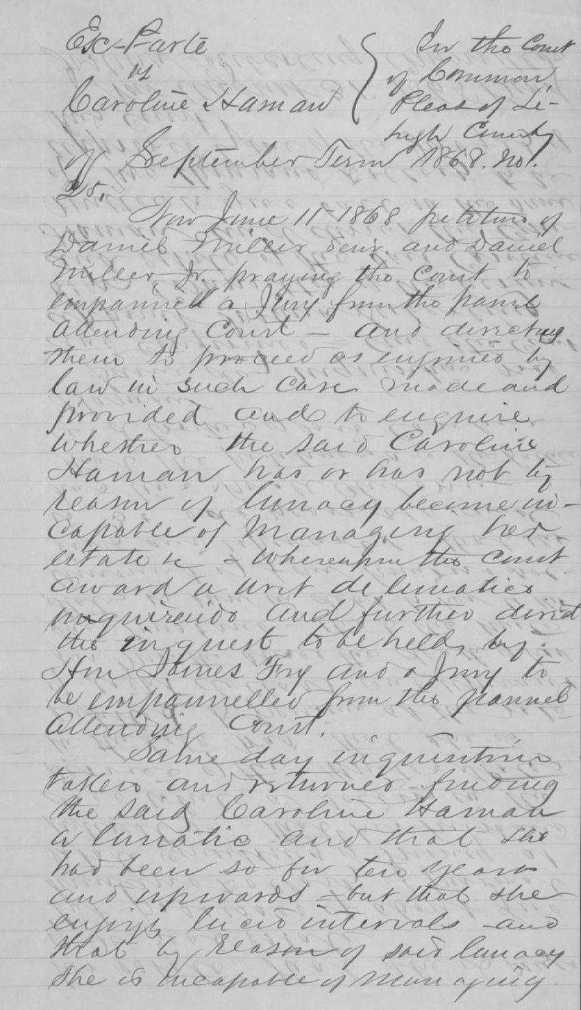 Excerpt from 1868 court petition by Caroline Herman’s father and brother to have her declared incompetent, p. 1_pubdom