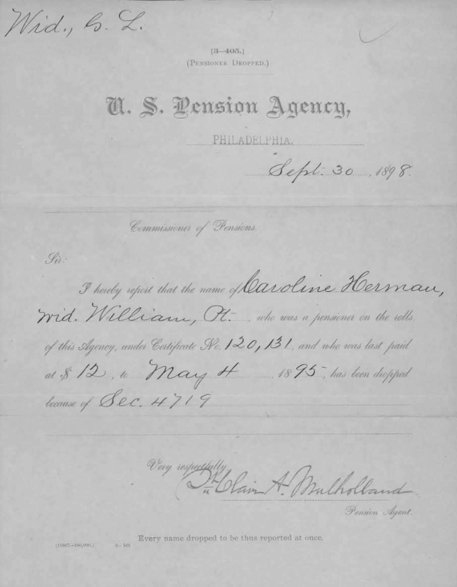 Caroline Herman’s U.S. Civil War Widow’s Pension File_Caroline’s Death and Deletion from Pension Rolls, 1898_pubdom