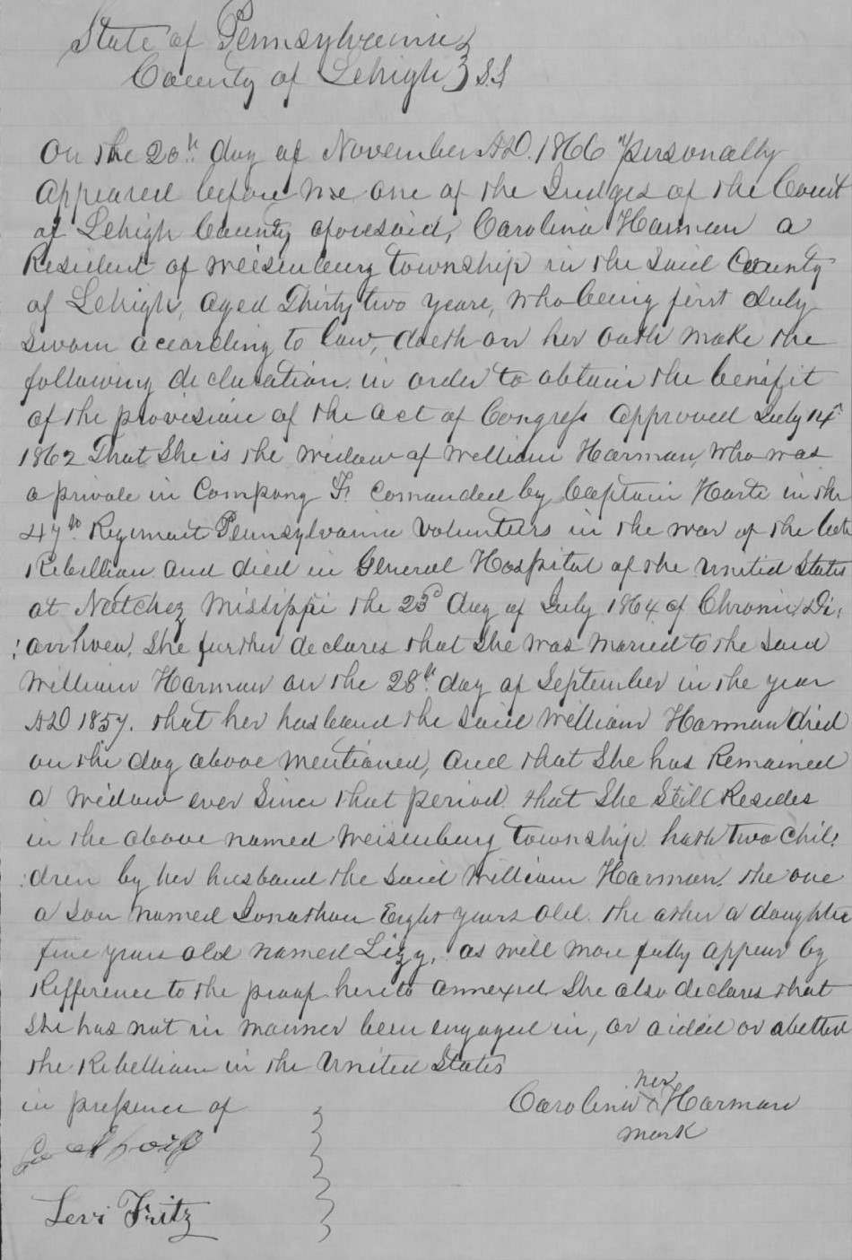 Caroline Herman’s U.S. Civil War Widow’s Pension Claim, Caroline’s Affidavit, 20 Nov 1866, pp. 1-2_pubdom