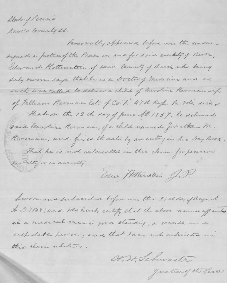 Caroline Herman’s U.S. Civil War Widow’s Pension Claim, Hottenstein Affidavit, 21-24 Aug 1868, pp. 1-2_pubdom