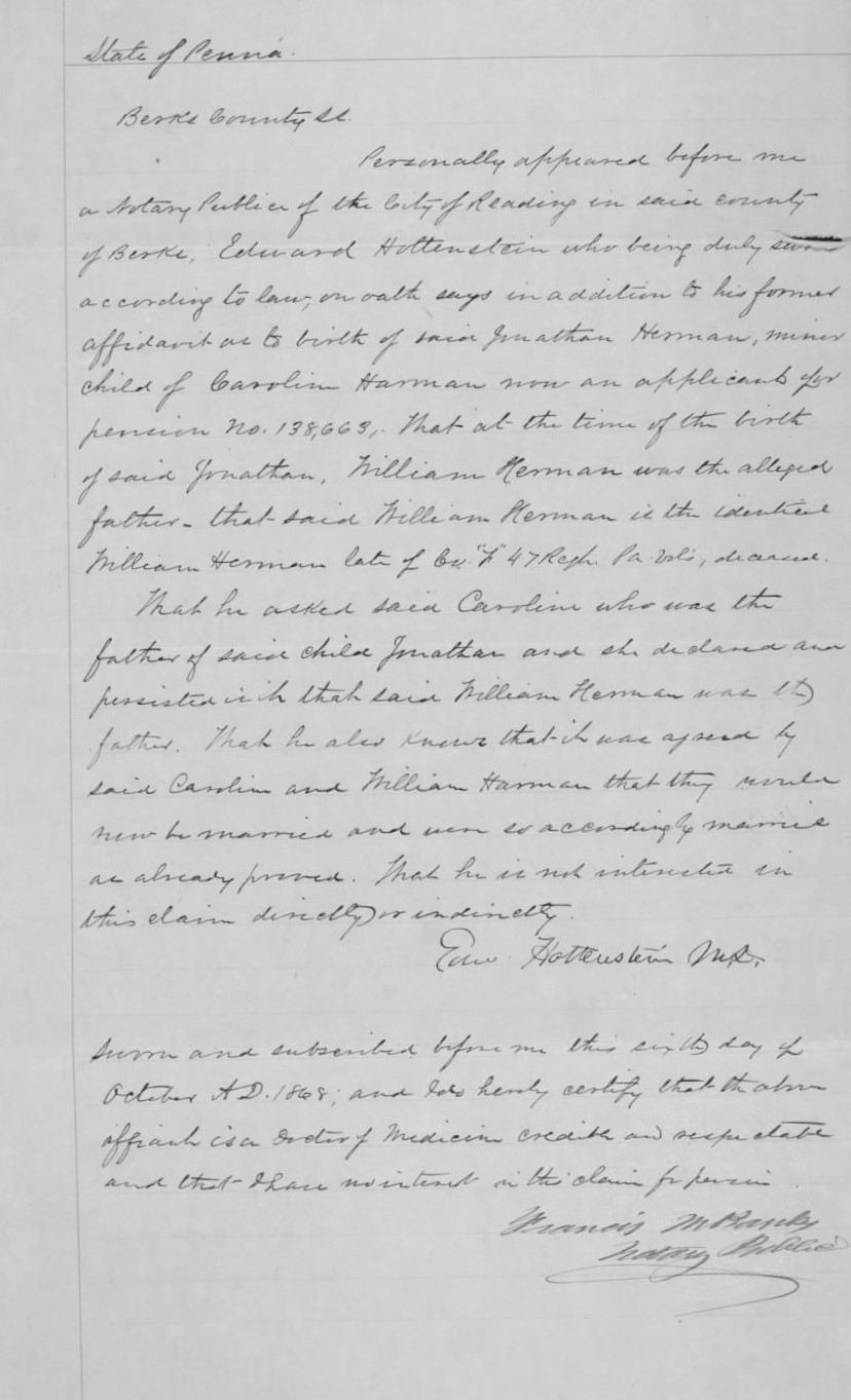 Caroline Herman’s U.S. Civil War Widow’s Pension Claim, Hottenstein Affidavit No. 2, 6 Oct 1868_pubdom